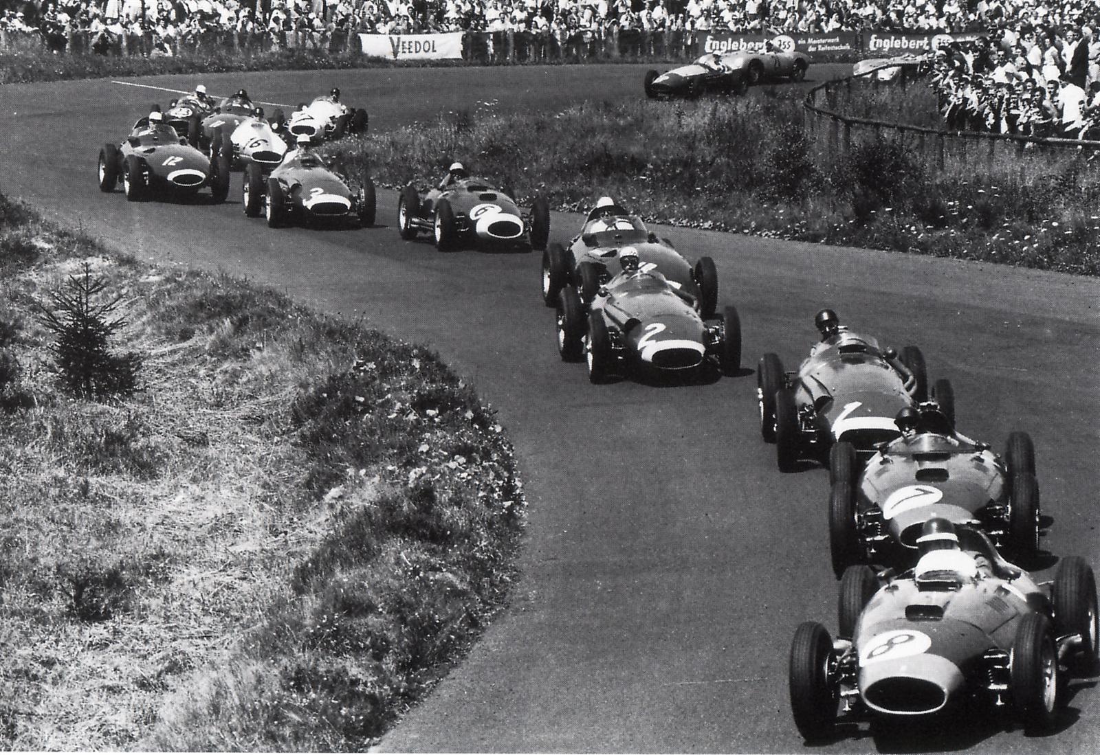 With Vanwall having proved themselves to be competitive with victory at the British GP, there was much excitement as the Grand Prix teams gathered at the Nurburgring with Lancia-Ferrari and Maserati keen to get their revenge. The field was as normal with Lancia-Ferrari fielding Mike Hawthorn, Peter Collins and Luigi Musso and Maserati running Juan-Manuel Fangio, Jean Behra and Harry Schell in their leading cars. The field was bolstered by Formula 2 machinery which included a trio of Porsches and various Cooper-Climaxes.
