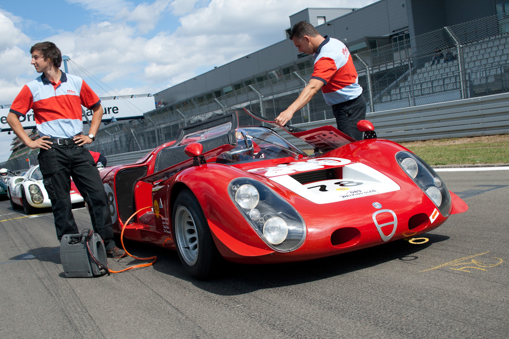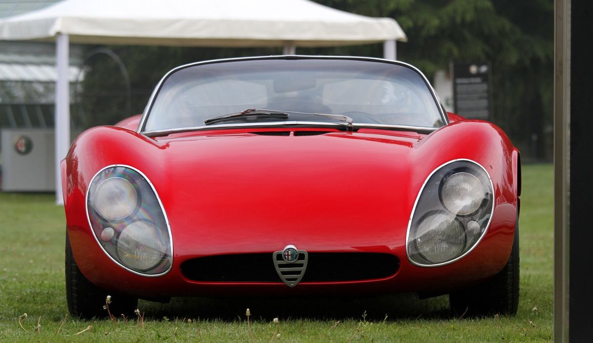Produziert wurde der kompromissloseste aller Straßen-Alfas von 1967-1969. Klingt verhältnismäßig lange, aber dennoch entstanden insgesamt nur 25 Stück (Aufschlüsselung folgt unten) dieses notdürftig straßentauglich gemachten Renners. Angetrieben von einem ultrascharfen 90-Grad-V8 mit 1995 ccm, der 230 PS bei 8800 U/min (spätere Leistungsmessungen ergaben sogar 250PS, man mußte den Motor nur einfach noch höher drehen lassen!!!) auf die Hinterachse stemmte, erreichte die Aluflunder für damalige Verhältnisse irrsinnige 260 km/h... genehmigte sich dabei aber auch die Kleinigkeit von bescheidenen 30 Litern Super auf 100 km (laut schmeichelnder Werksangabe. Real dürfte es ein wenig mehr gewesen sein).