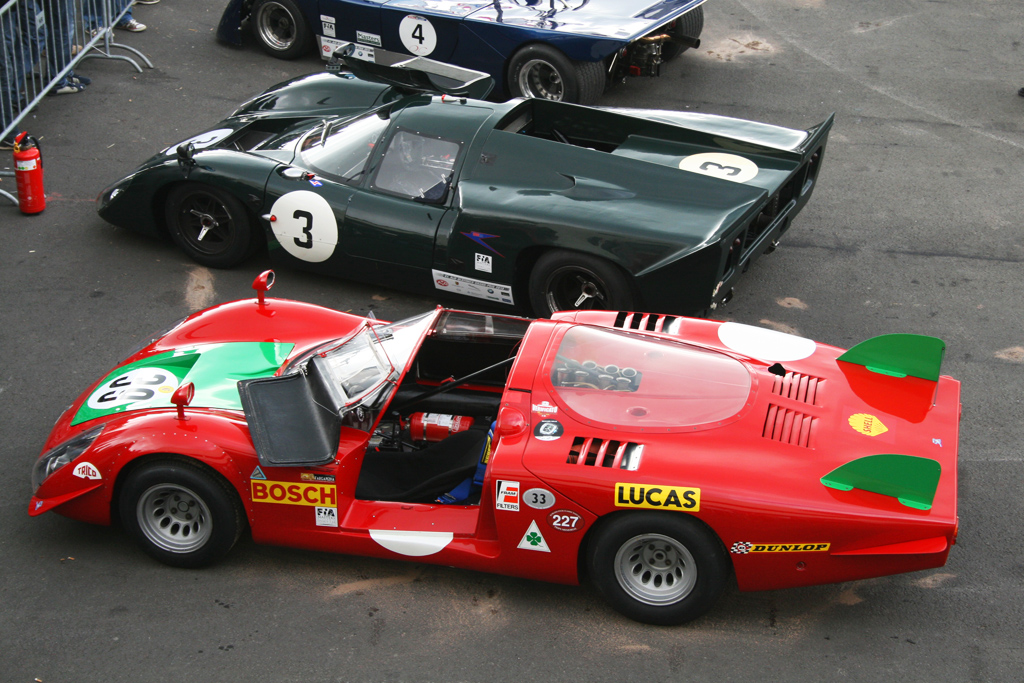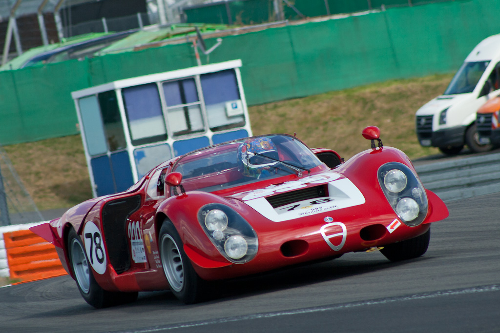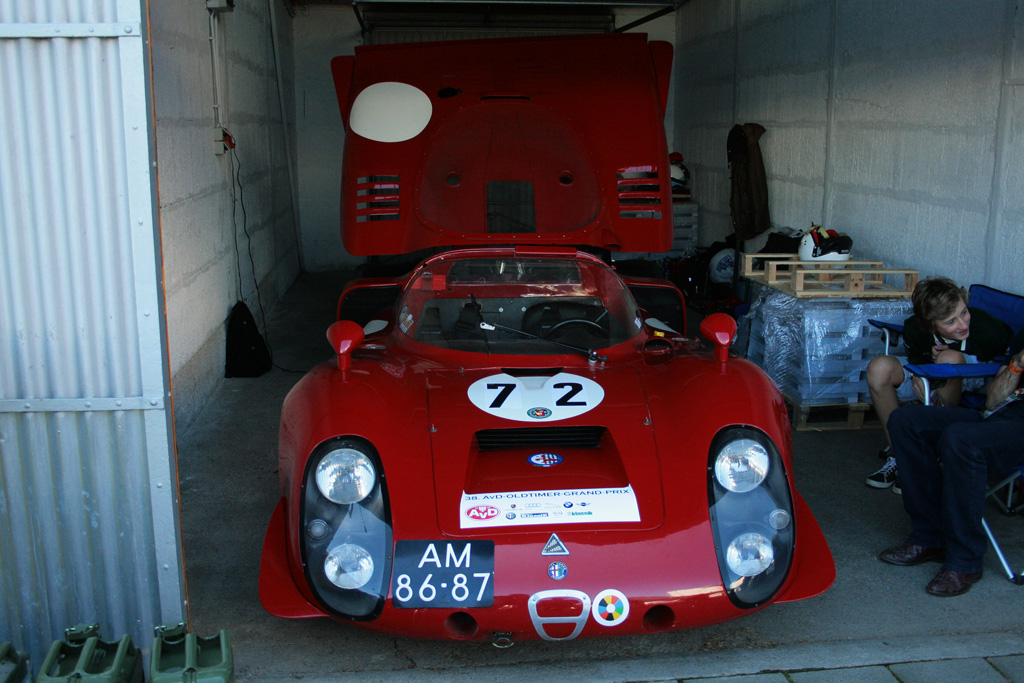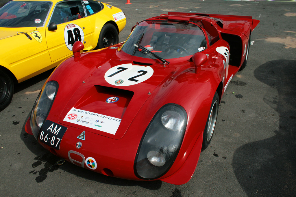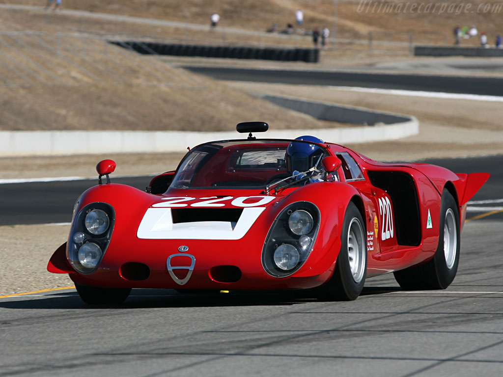 Produziert wurde der kompromissloseste aller Straßen-Alfas von 1967-1969. Klingt verhältnismäßig lange, aber dennoch entstanden insgesamt nur 25 Stück (Aufschlüsselung folgt unten) dieses notdürftig straßentauglich gemachten Renners. Angetrieben von einem ultrascharfen 90-Grad-V8 mit 1995 ccm, der 230 PS bei 8800 U/min (spätere Leistungsmessungen ergaben sogar 250PS, man mußte den Motor nur einfach noch höher drehen lassen!!!) auf die Hinterachse stemmte, erreichte die Aluflunder für damalige Verhältnisse irrsinnige 260 km/h... genehmigte sich dabei aber auch die Kleinigkeit von bescheidenen 30 Litern Super auf 100 km (laut schmeichelnder Werksangabe. Real dürfte es ein wenig mehr gewesen sein).