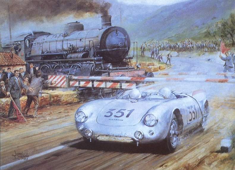 (der in diesem Jahr am 11.06. auch seinen 80. Geburtstag feiern kann) erneut den Klassensieg und einen sechsten Platz im Gesamtklassement herausfahren. Spektakuläres Intermezzo dabei war seine Aktion an einem Bahnübergang. Als die Bahnschranken für den Schnellzug nach Rom geschlossen wurden nahm Hans Herrmann nicht den Fuß vom Gas und bremste sondern er und sein Beifahrer duckten sich in das Cockpit und fuhren mit ihrem flachen 550 Spyder direkt vor dem herankommenden Zug unter der geschlossenen Schranke hindurch.